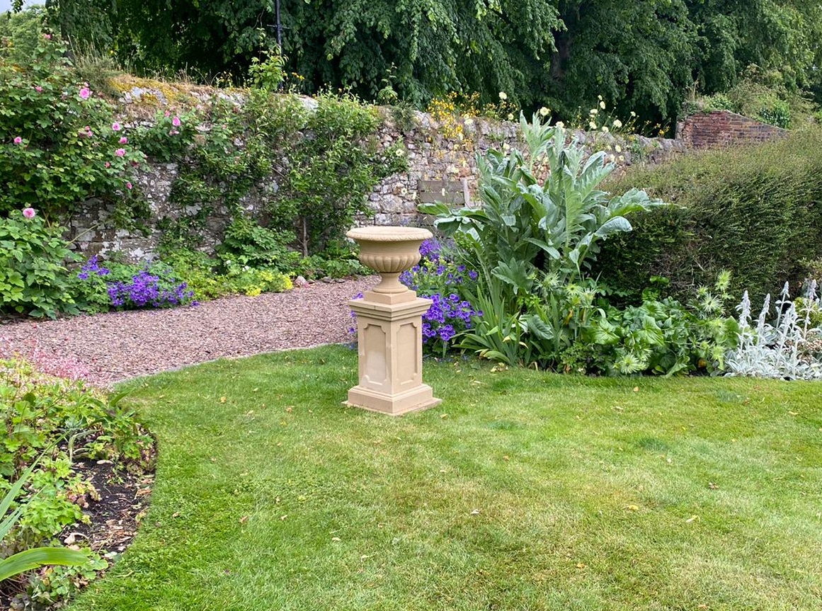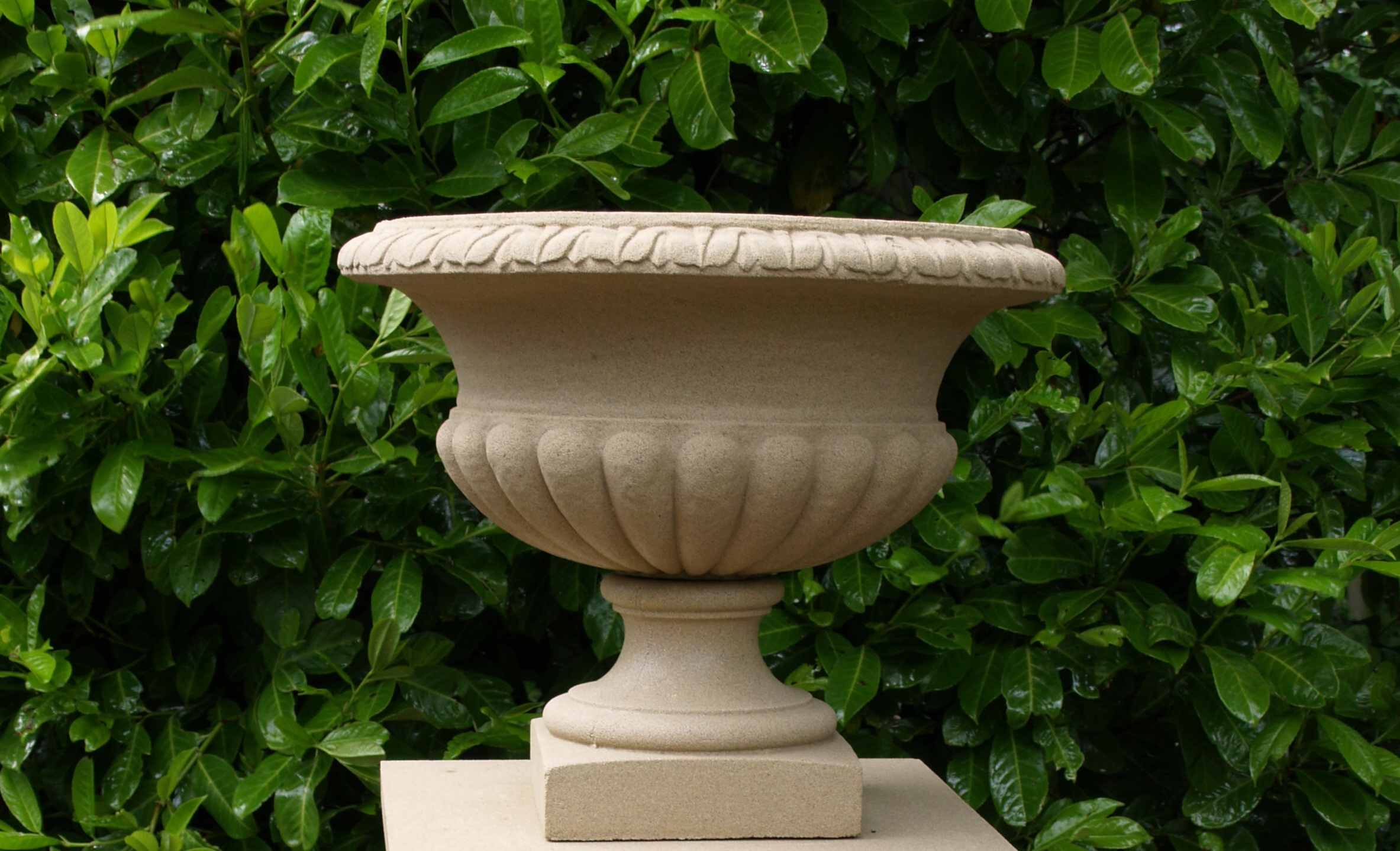 The Hampton Urn features leaf pattern to the rim with the main body gadrooned down to the base. Suitable for small to medium planting.